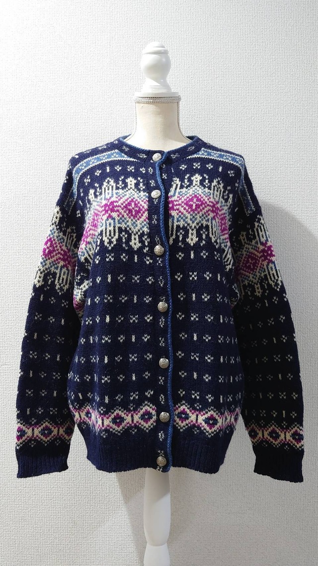 素晴らしい色使いで編み上げられたフェアアイル調のグッドデザイン! 最高の風合いと称される高品質のスカンジナビアン・ラムズウールを使用したモチモチのニットカーディガン エレガントな雰囲気もあわせ持つとても素敵な1着です! サイズ・・・レディース 14 (身幅54cm着丈63cm肩幅47cm袖丈54cm) ※トルソーサイズ9号 状態:目立つ汚れやダメージなどなく良好です。 クリーニング済み カラー・・・マルチ 素材・・・SCANDINAVIAN LAMBS WOOL 100% MADE IN SWEDEN 60-70年代ヴィンテージ 60-70’s Jersey Modeller スウェーデン製 ウールニット カーディガン サイズ14 ※平置きでの採寸の為、多少の誤差が生じる場合がございます。 ※商品写真の色合いは実際の商品と若干異なる場合がございます。 ※ユーズドもしくは、ビンテージ品のため使用感や細かいキズ、汚れがある場合もございますのでご了承ください。