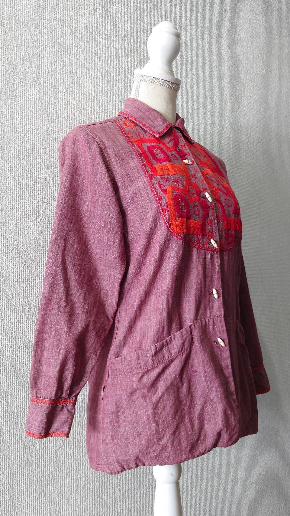 ループ留めオープンカラー仕様のライトな一着には、エスニックな刺繍と装飾が雰囲気良く施されています。