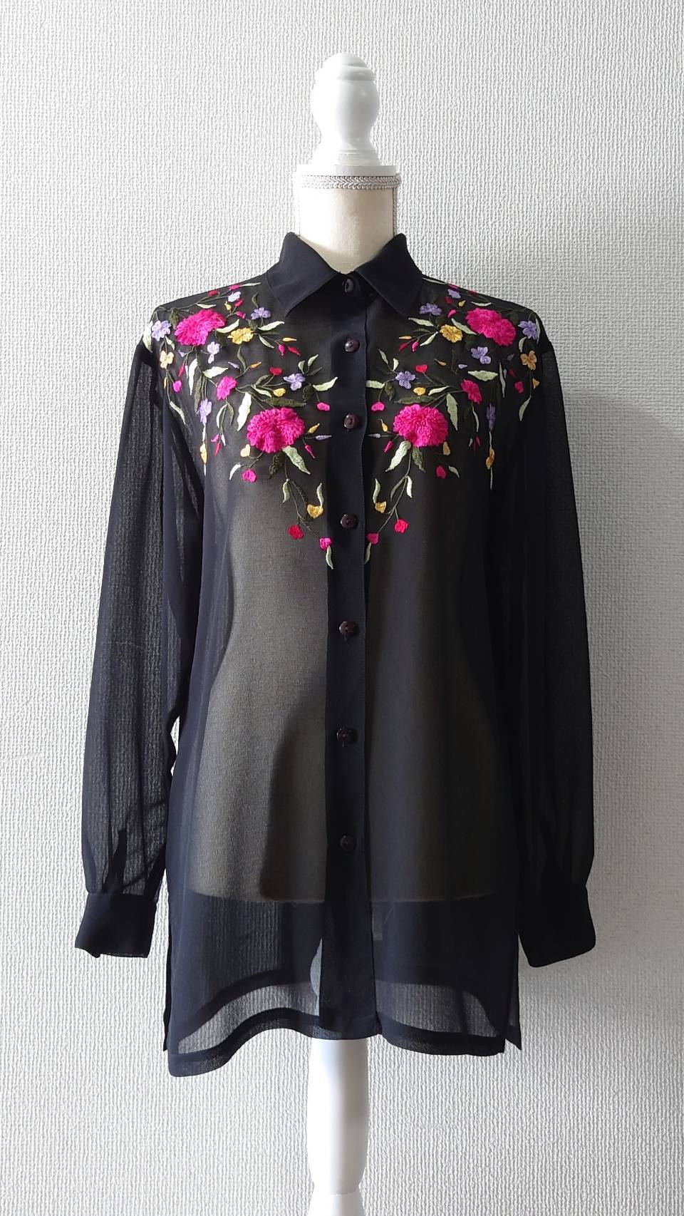 シックなブラックのシアーシャツに、花柄の刺繍が鮮やかに映えます!