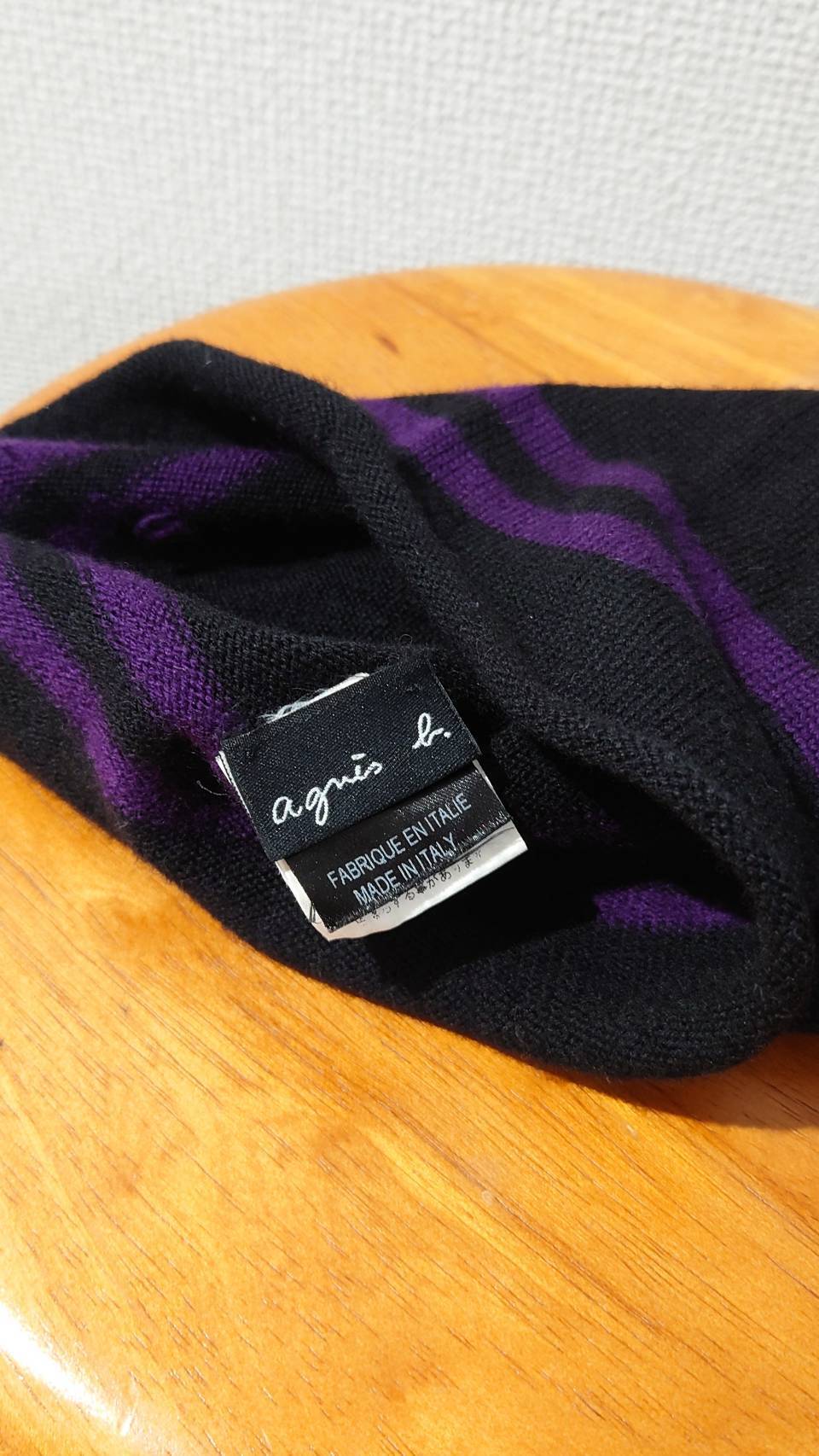ミニマルなブラックのニットビーニーにパープルのダブルライン