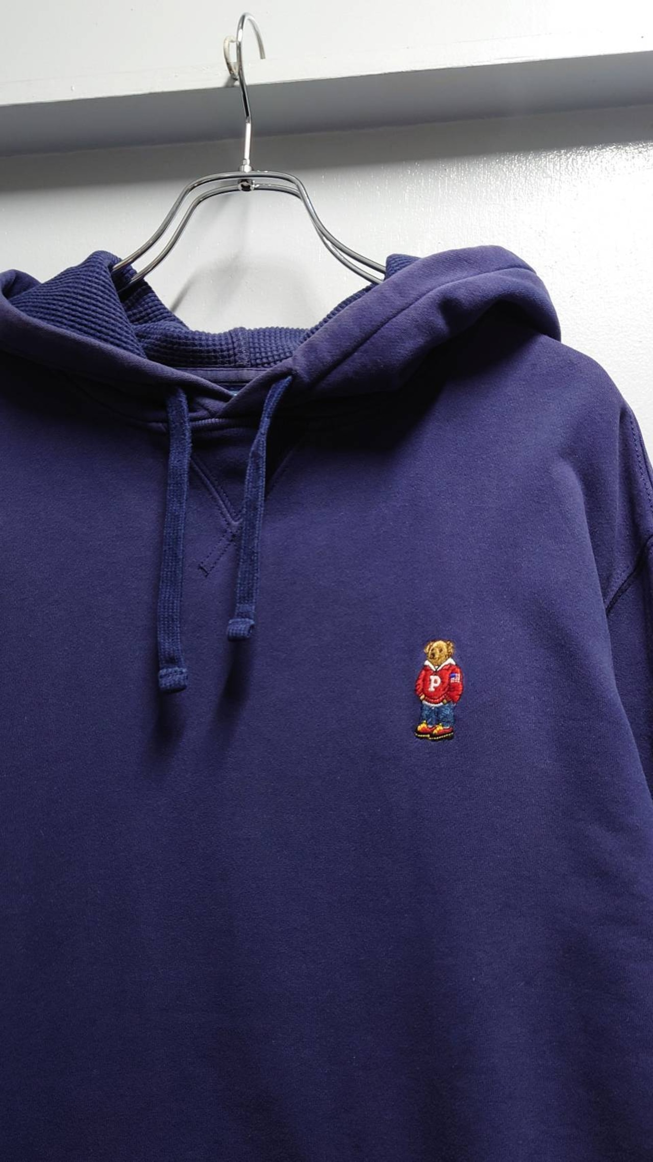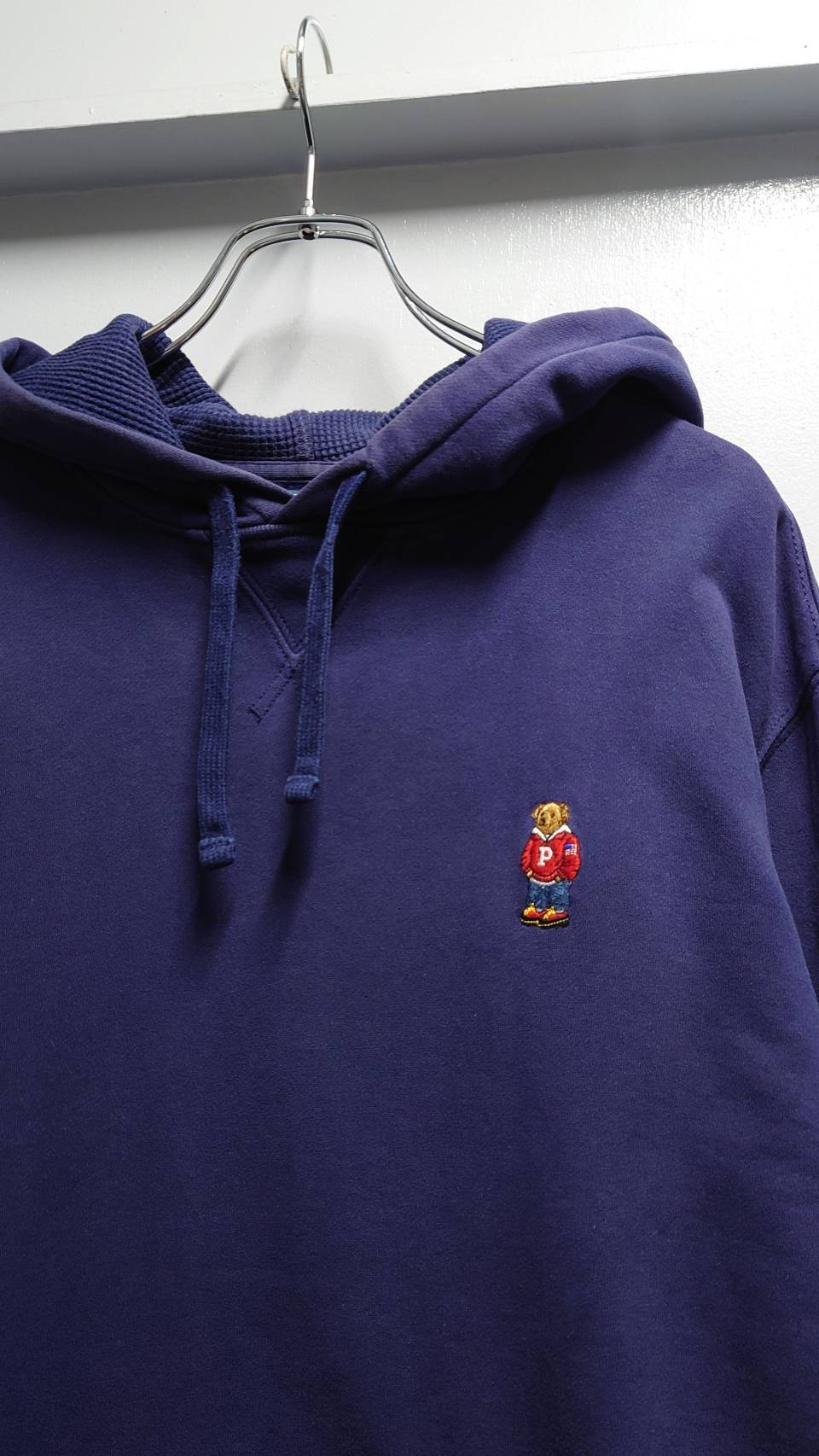 フード裏サーマル、前Vガゼット付きのクラシックなディテールにワンポイントのポロベア!