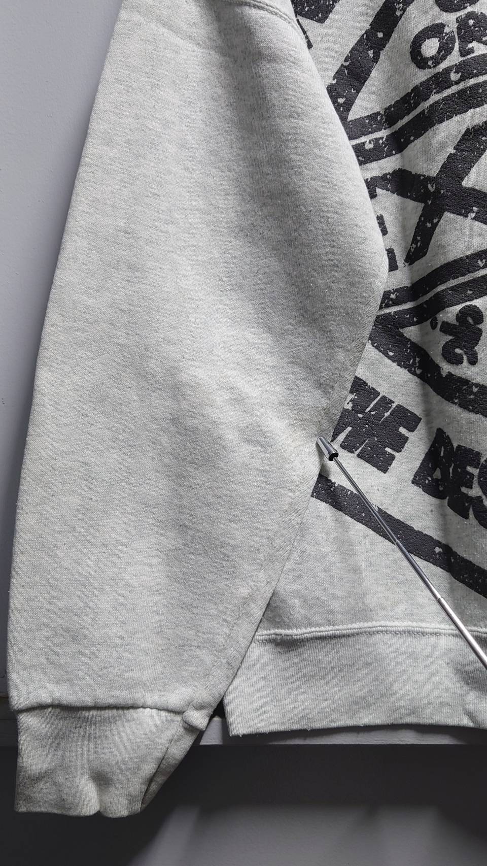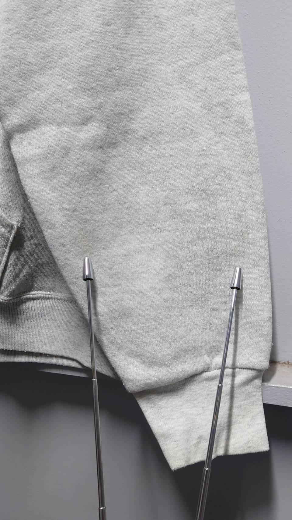 状態:細かい毛羽立ち、ネック周りに若干の黄ばみ、袖に数か所のシミ、袖先のリブにダメージがあります。