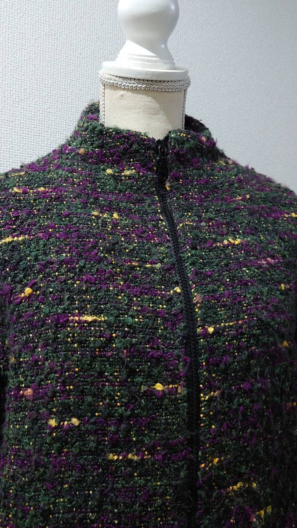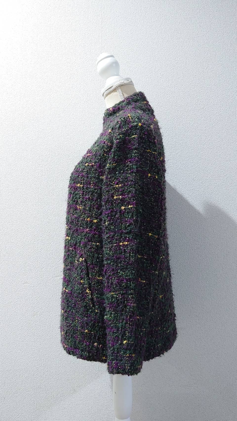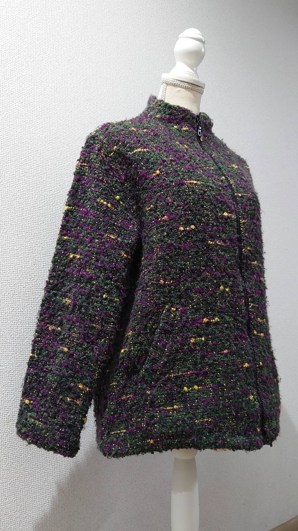 オリーブグリーンをベースにパープルやイエローが混じるネップニット