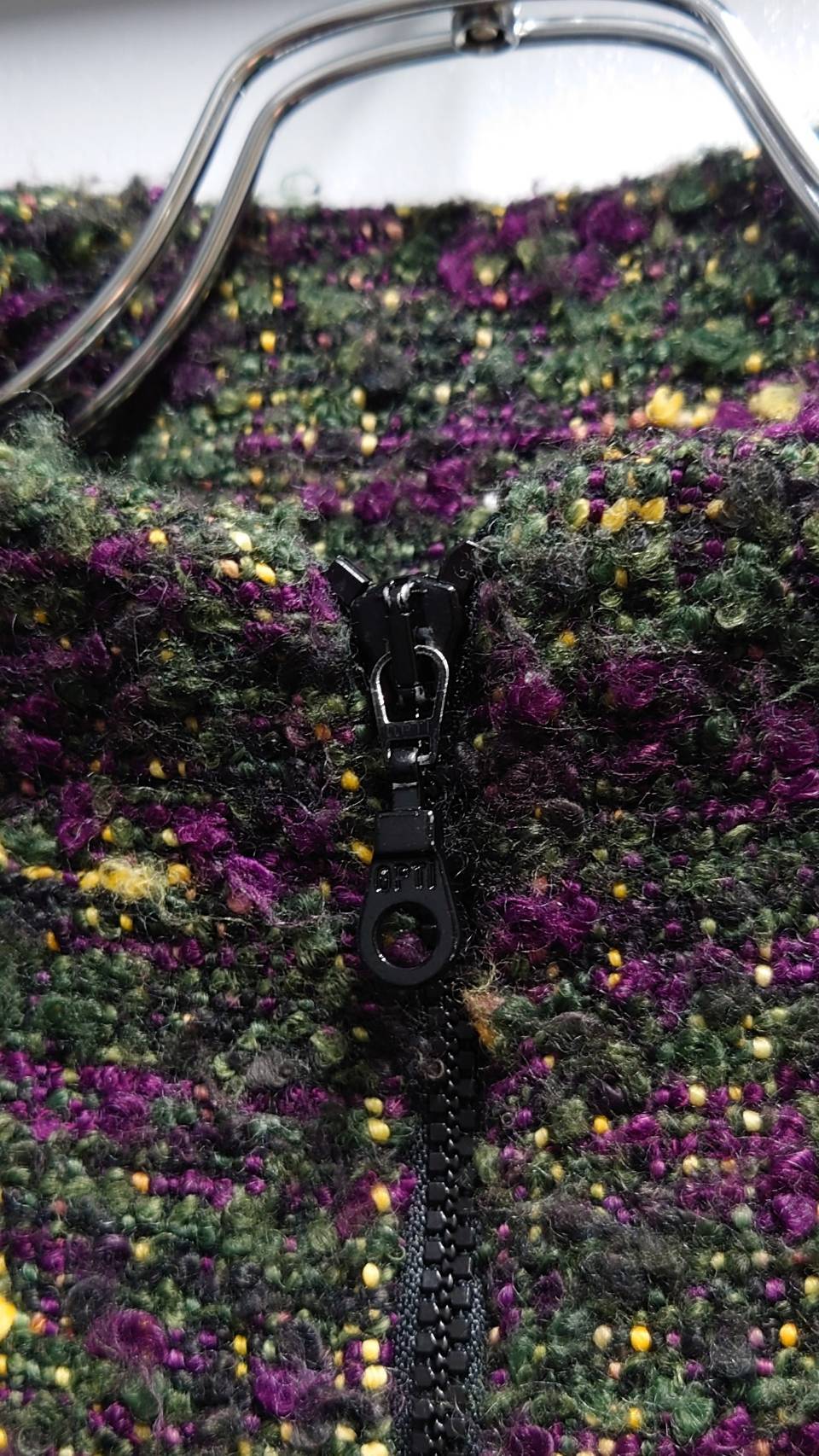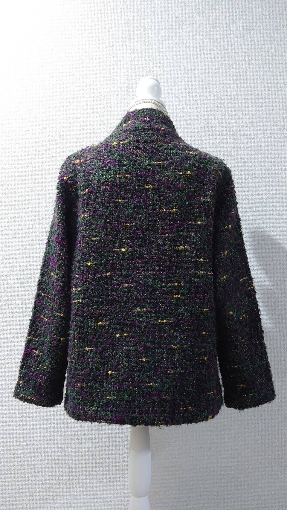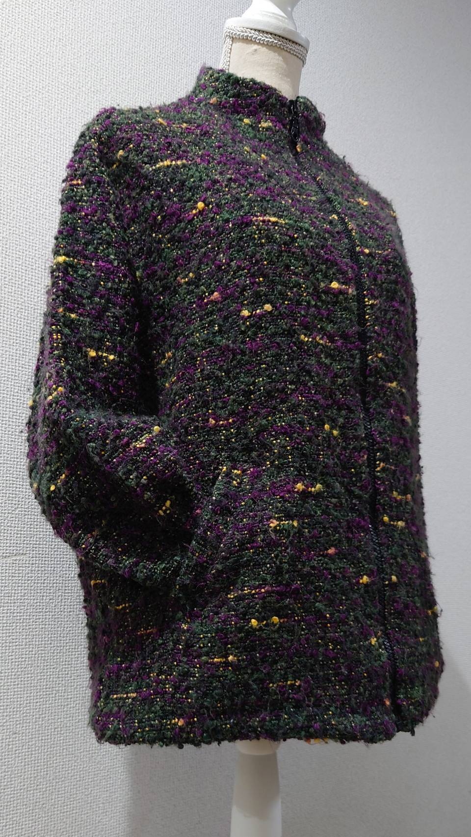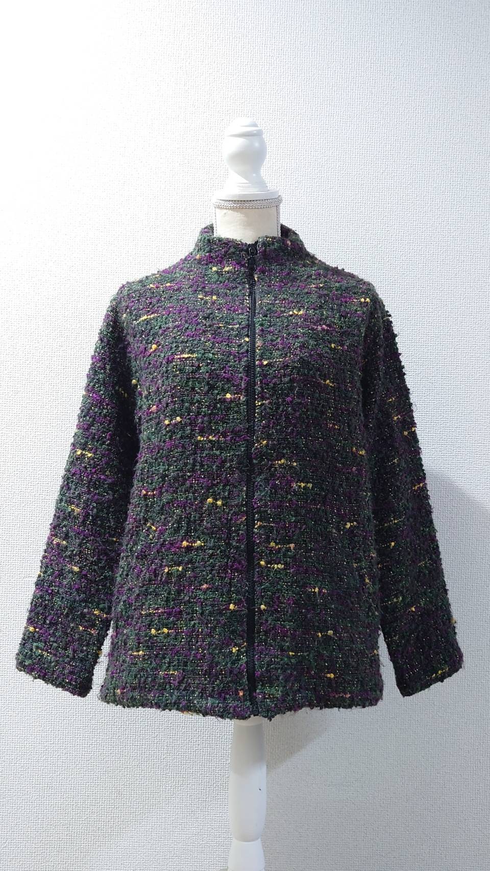 オリーブグリーンをベースにパープルやイエローが混じるネップニット