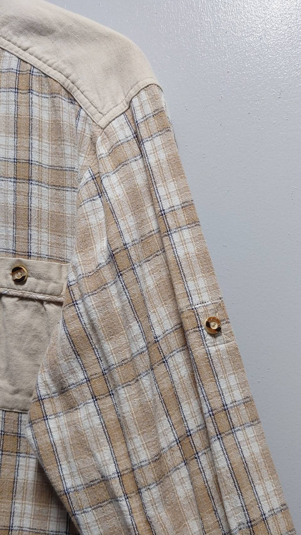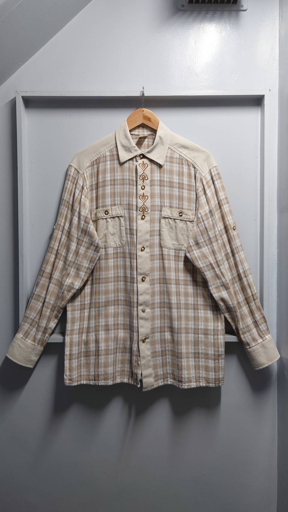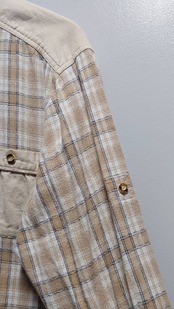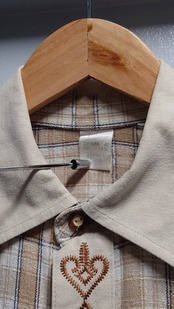 スゴく良い配色のチェック柄チロリアンシャツ。コットンなんだけど麻っぽい通気性の良さそうな生地感です。