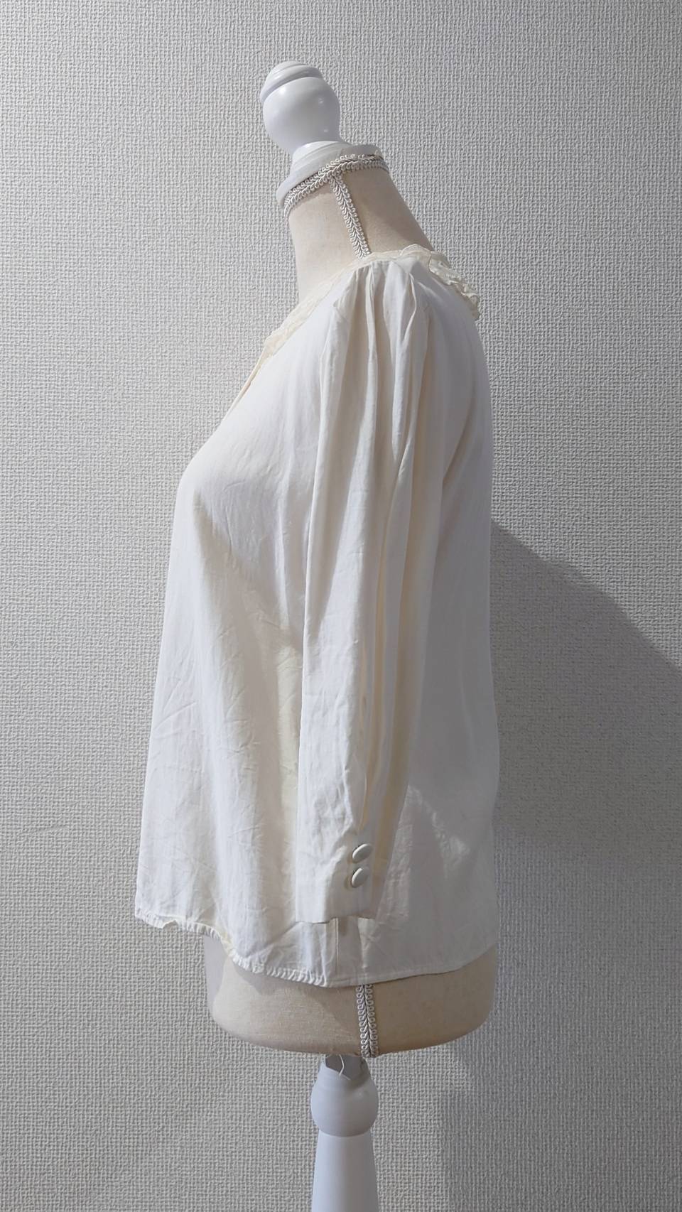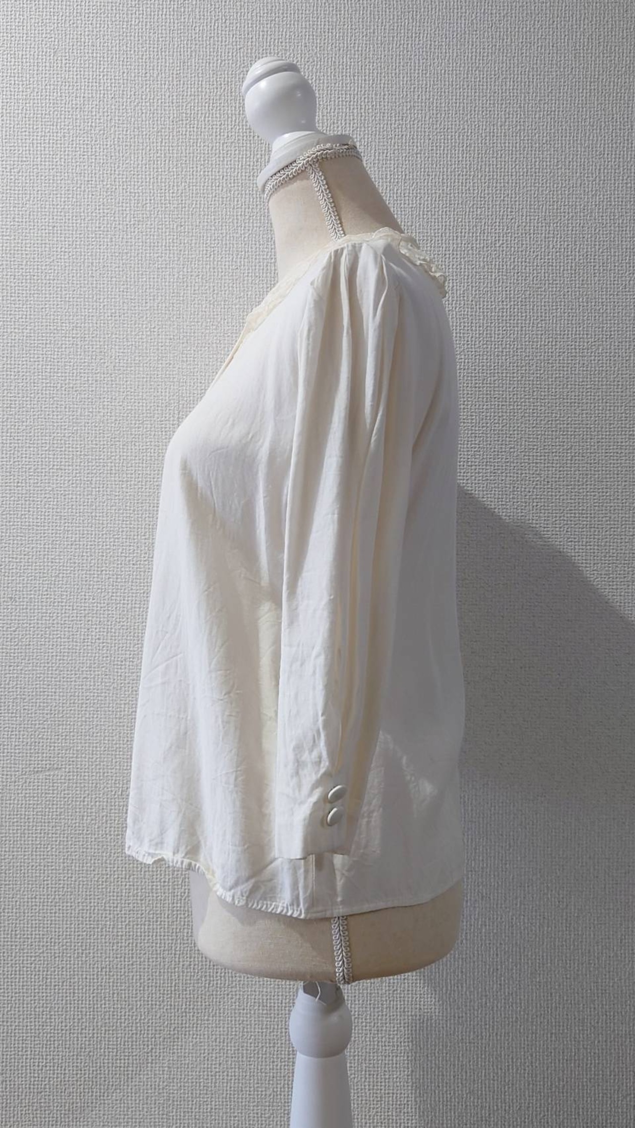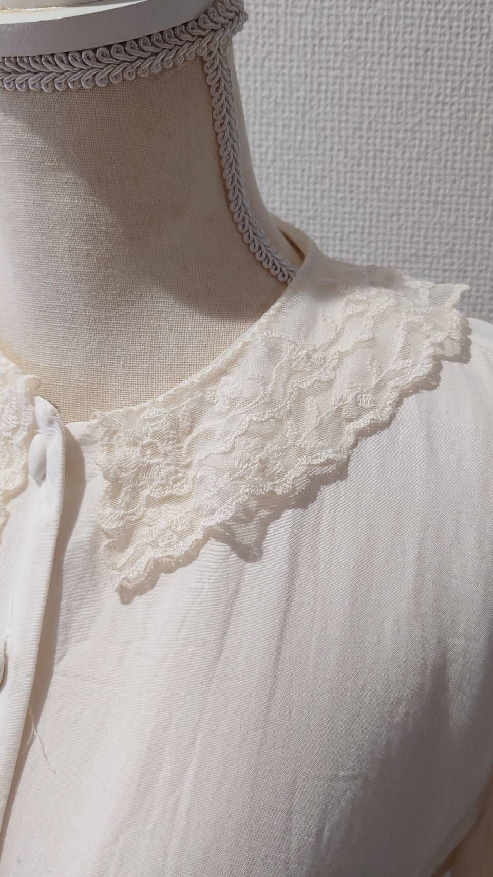 レース襟で七分袖。ボタンは下2つが隠れる仕様でタックインもしやすいです。