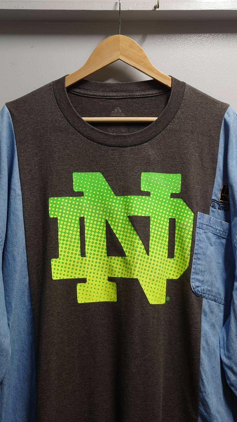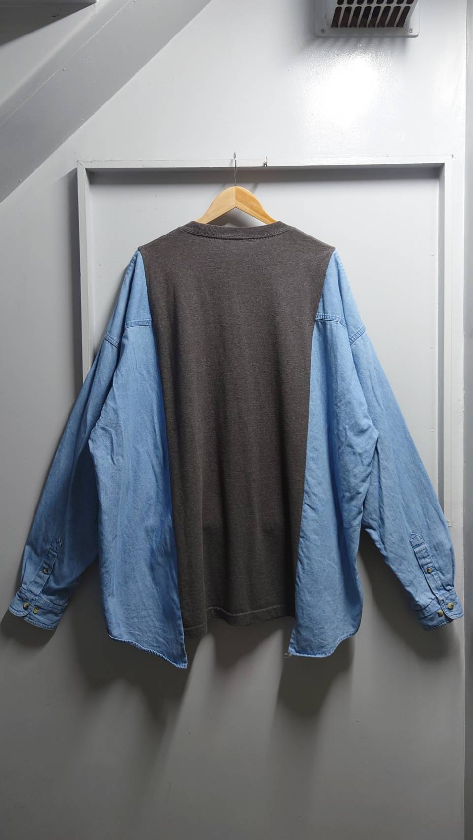 アディダス製のTシャツ(サイズ表記XXL)をベースにデニムシャツをドッキングしたリメイクならではのビッグサイズロンティー。